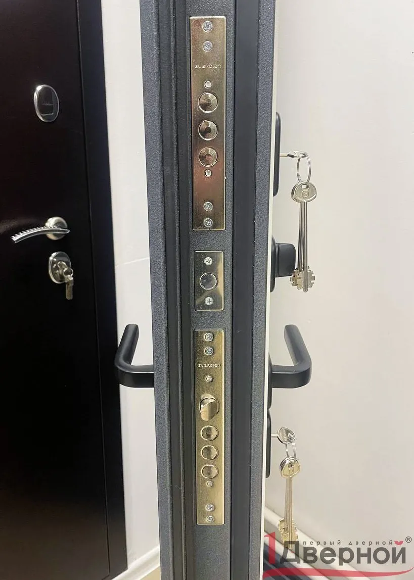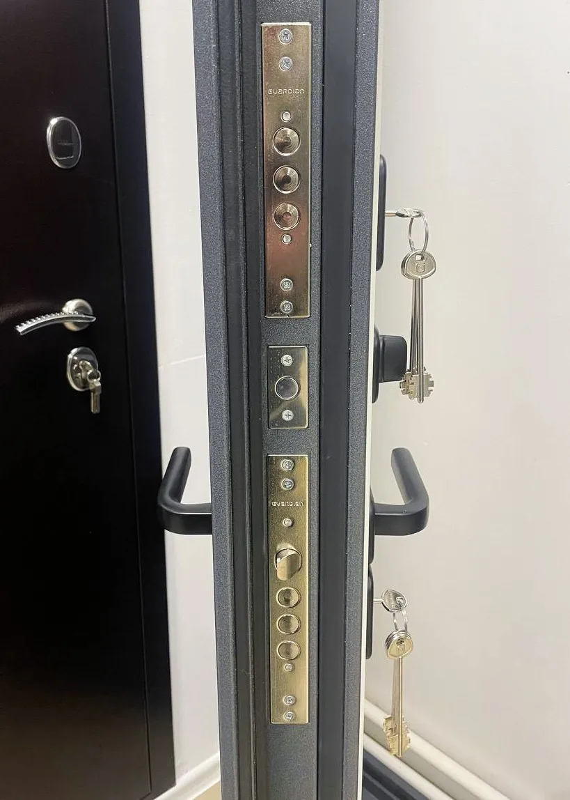 2 сувальдных замка - "Guardian 30.01" (3 класс прочности и взломостойкости) + ночная задвижка + эксцентрик для регулировки притвора двери.